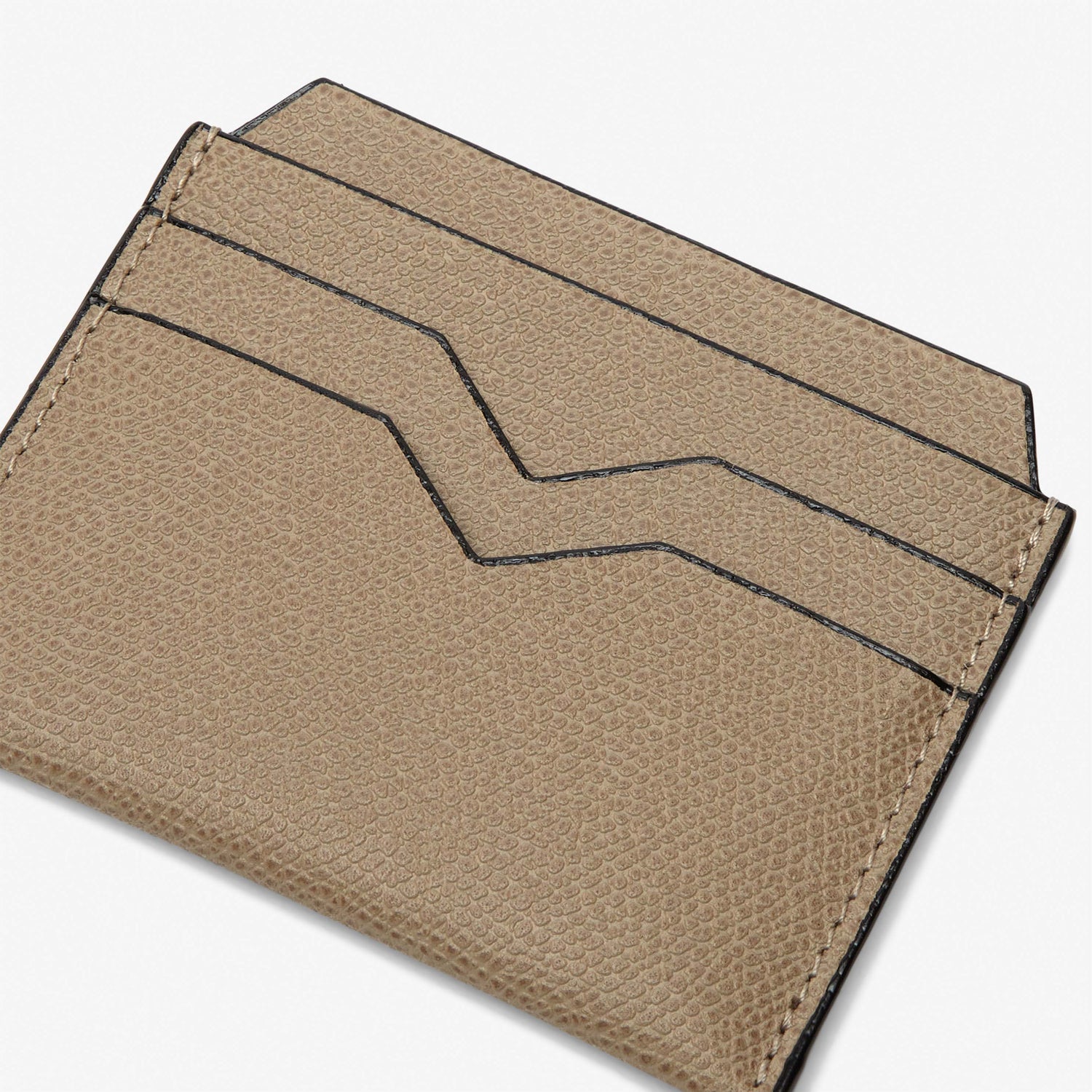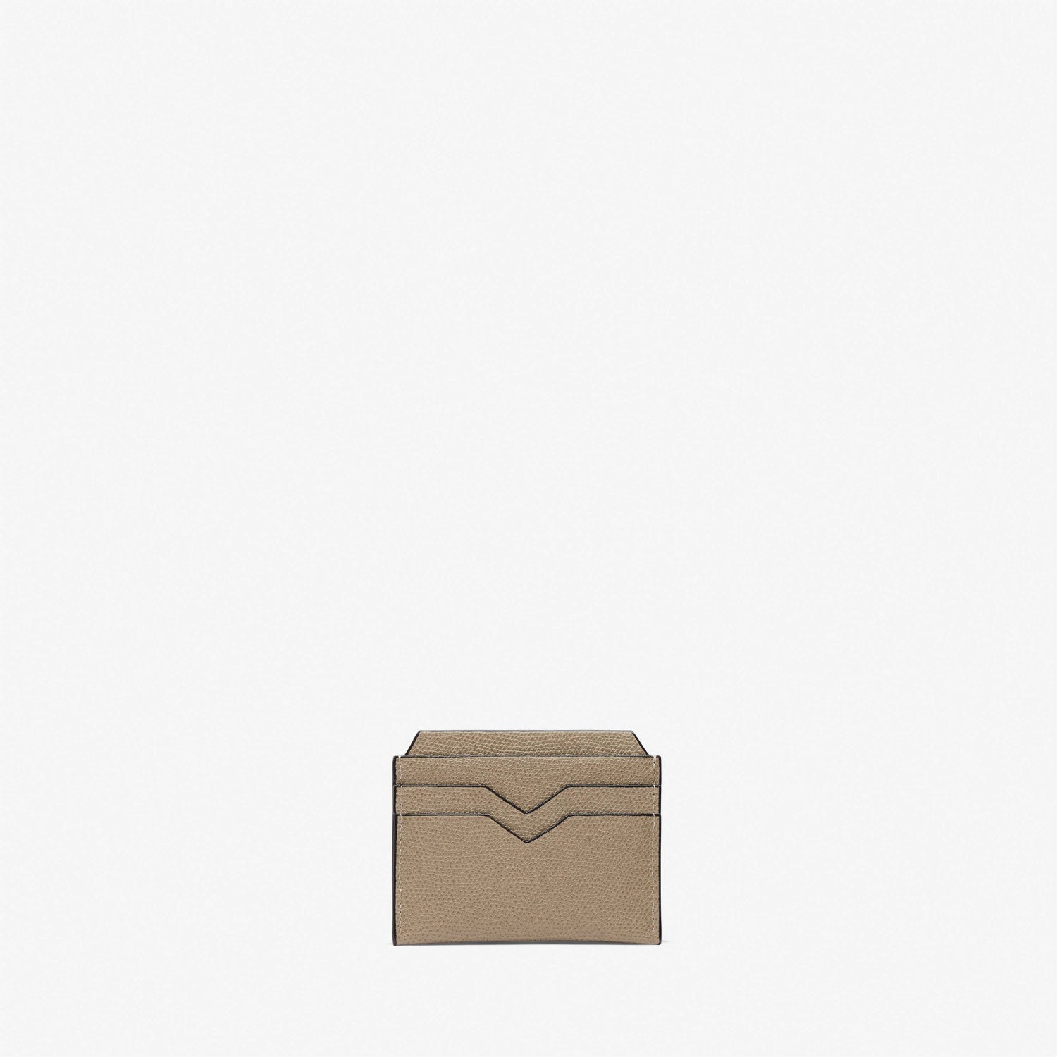 さりげなくエレガントな素材感のカードホルダーは、いつの世も必ず手元に置いておきたいアイテムです。ブランドの象徴であるV字カットが施された4つのクレジットカード用のスロットと中央に2つの仕切り付きスロット。ライナーは革張り。