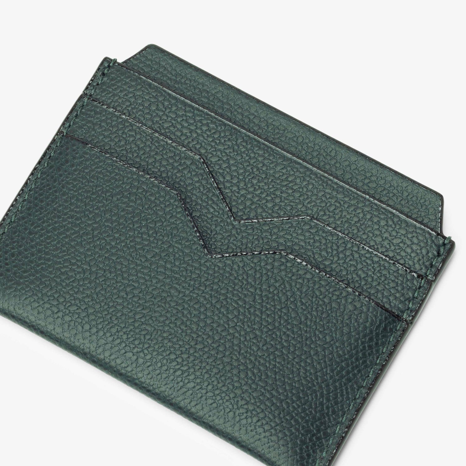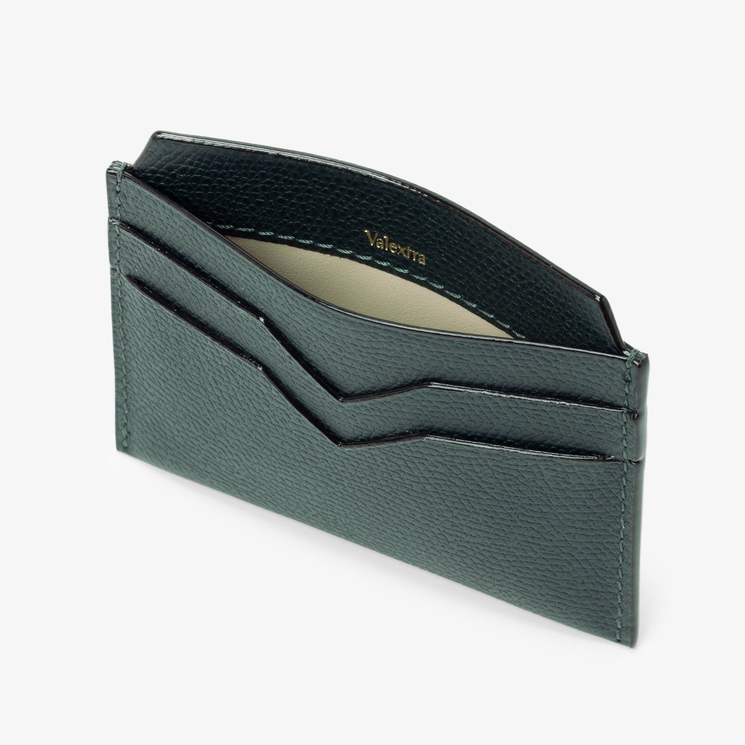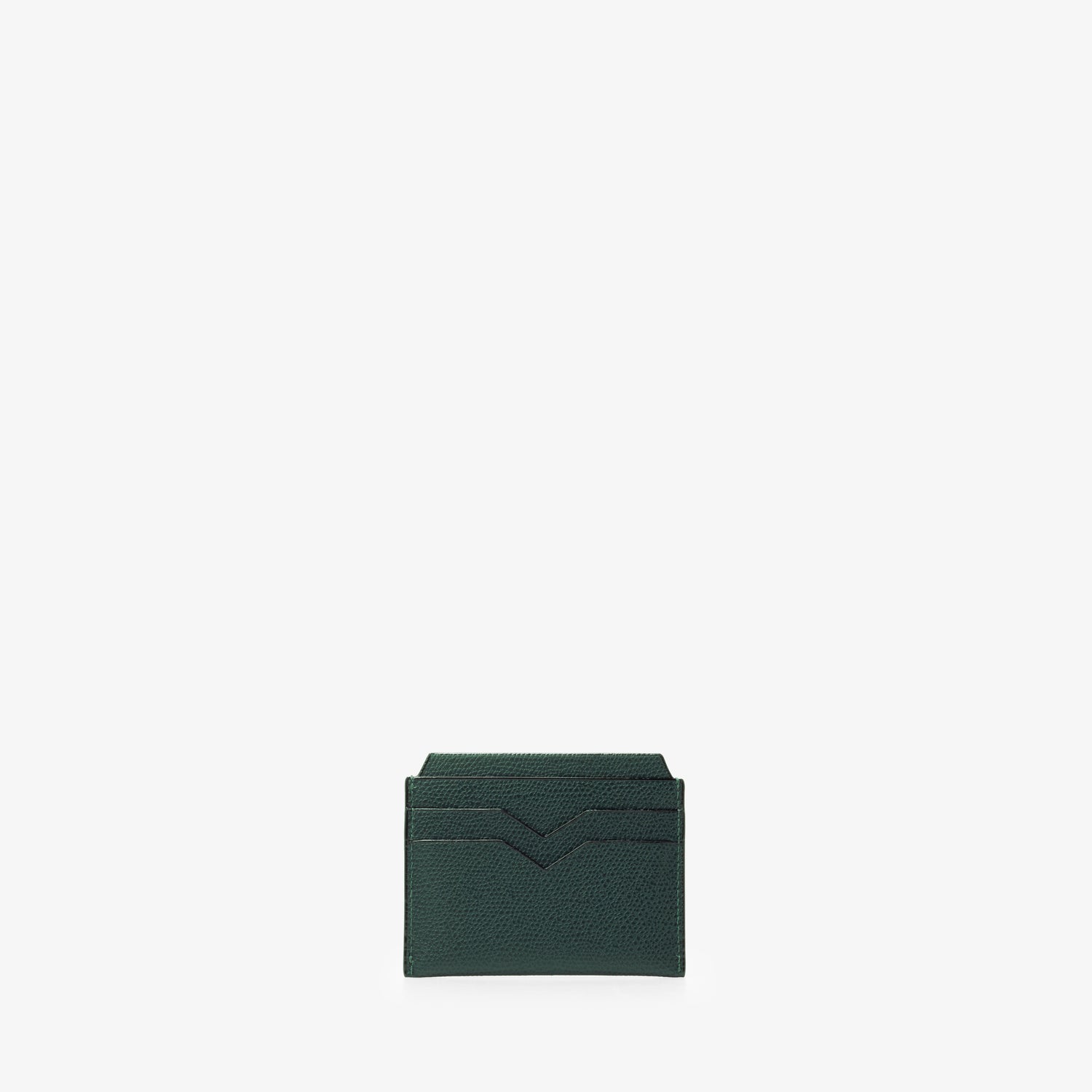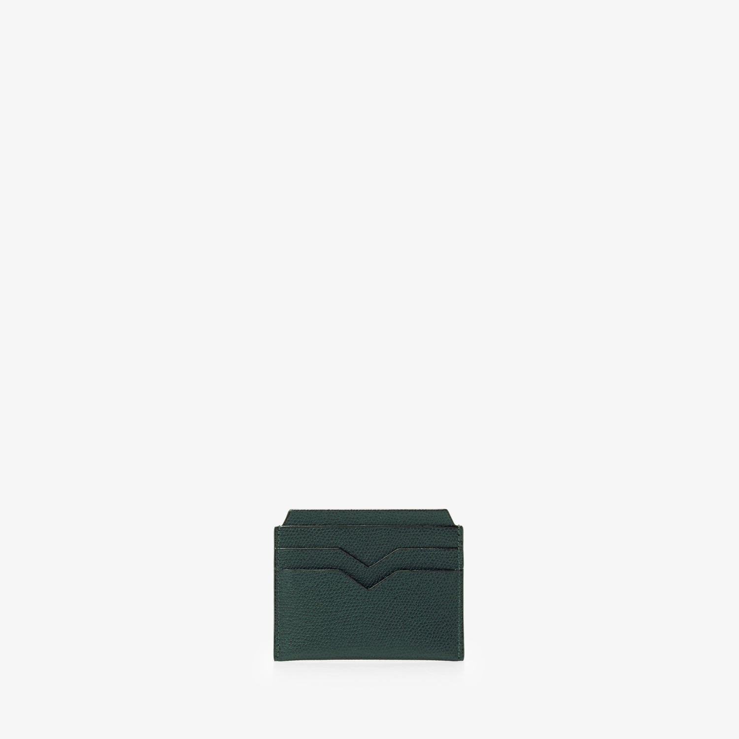 さりげなくエレガントな素材感のカードホルダーは、いつの世も必ず手元に置いておきたいアイテムです。ブランドの象徴であるV字カットが施された4つのクレジットカード用のスロットと中央に2つの仕切り付きスロット。ライナーは革張り。
