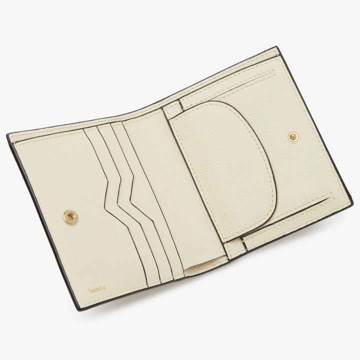 このコンパクトな財布は、エルゴノデザインである V カットを施したカードスロットとスナップフック付きの小銭入れを備え、カードと現金をきちんと整理して収納できます。パーツごとの境界を際立たせる手描きのインキオストロのラインや、コバに施された黒漆のコスタエッジペインティングなどのディテールが、ブランドの職人技へのこだわりを強調しています。