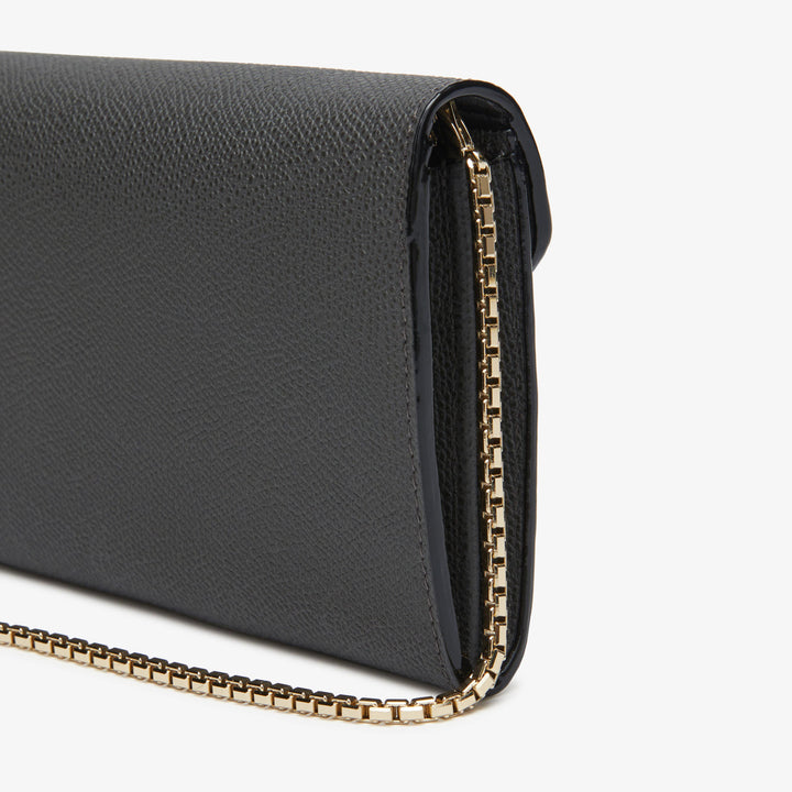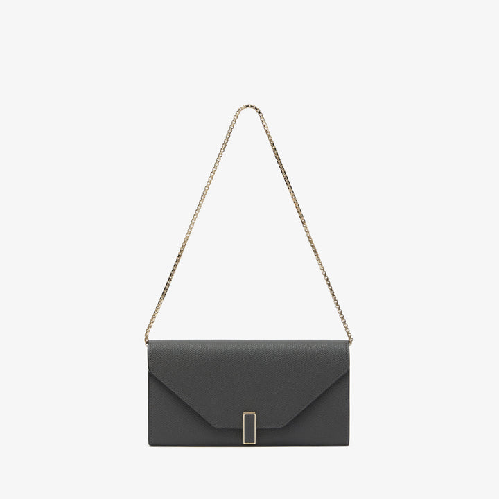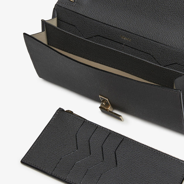素材はソフトカーフスキン製、内側にはコンパートメントが3つと6枚のカード用のスロット付き。取り外し可能なジッパー式コインケースにはカードスロットが4つあり、クラッチの中に入れて使うのはもちろん、コインケース単体でもお使いいただけます。ヴァレクストラのアイコニックなクロージャーと取り外し可能なゴールドのチェーンのショルダーストラップ付き。