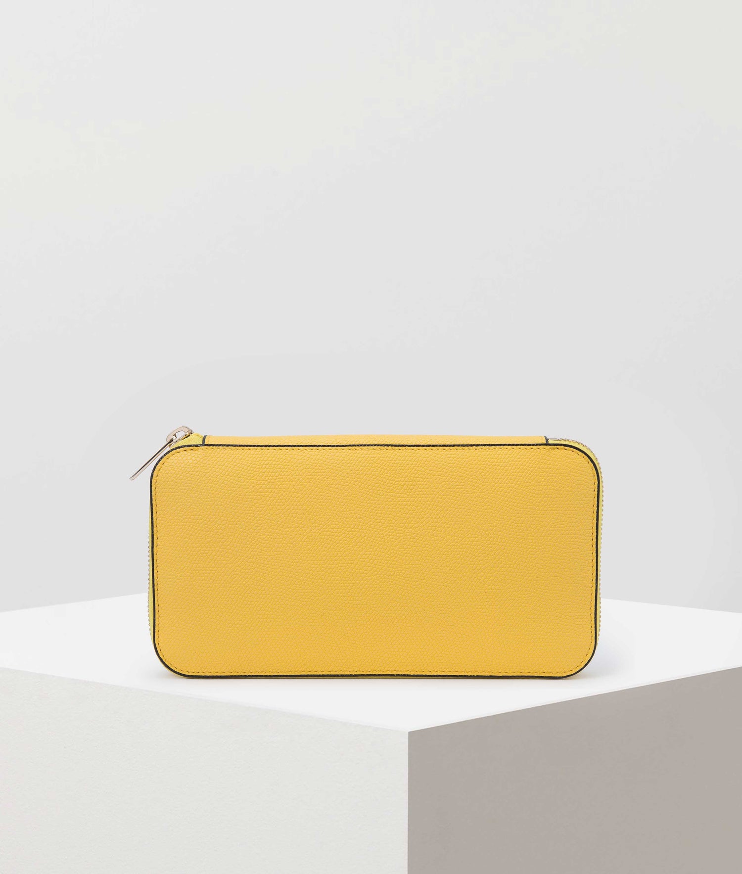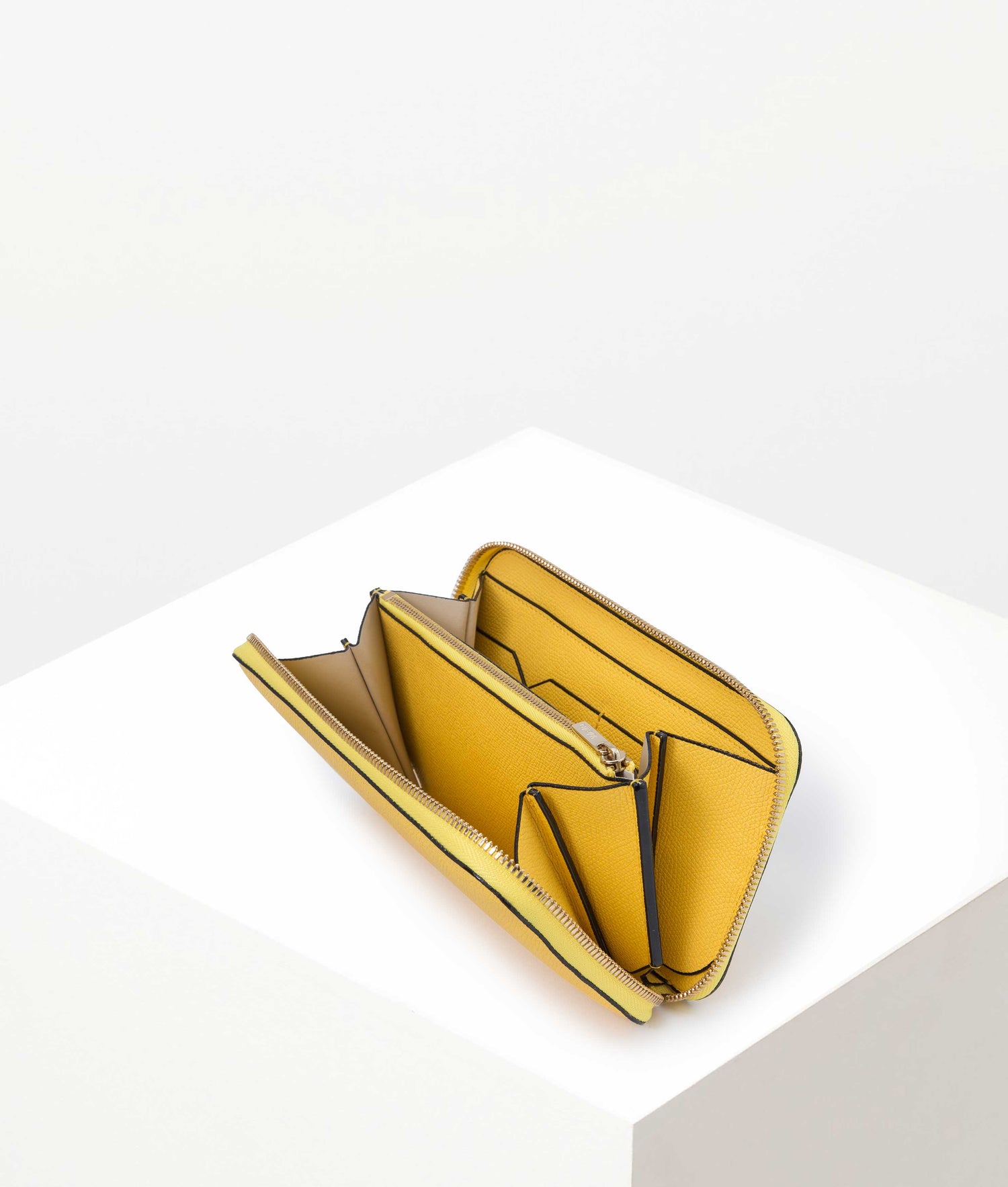 ラウンドジップ式の長財布。豊富なカラーバリエーションを展開しています。内側にはブランドの象徴であるV字カットが施された12枚用クレジットカードホルダー、紙幣や書類を収納できるフリーポケット2つと中央にはジップ式コインケース付き。パスポートも収納できるサイズです。
