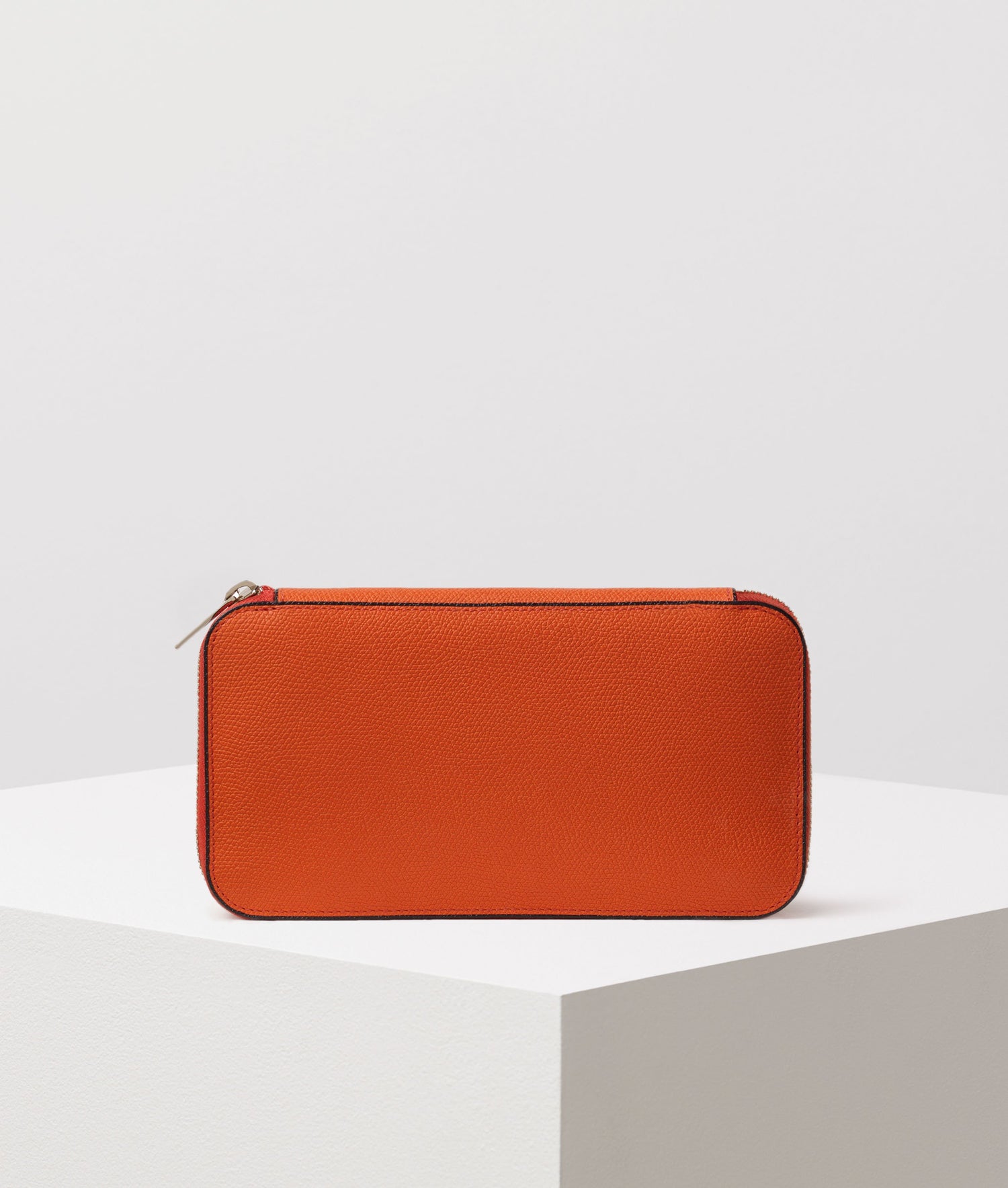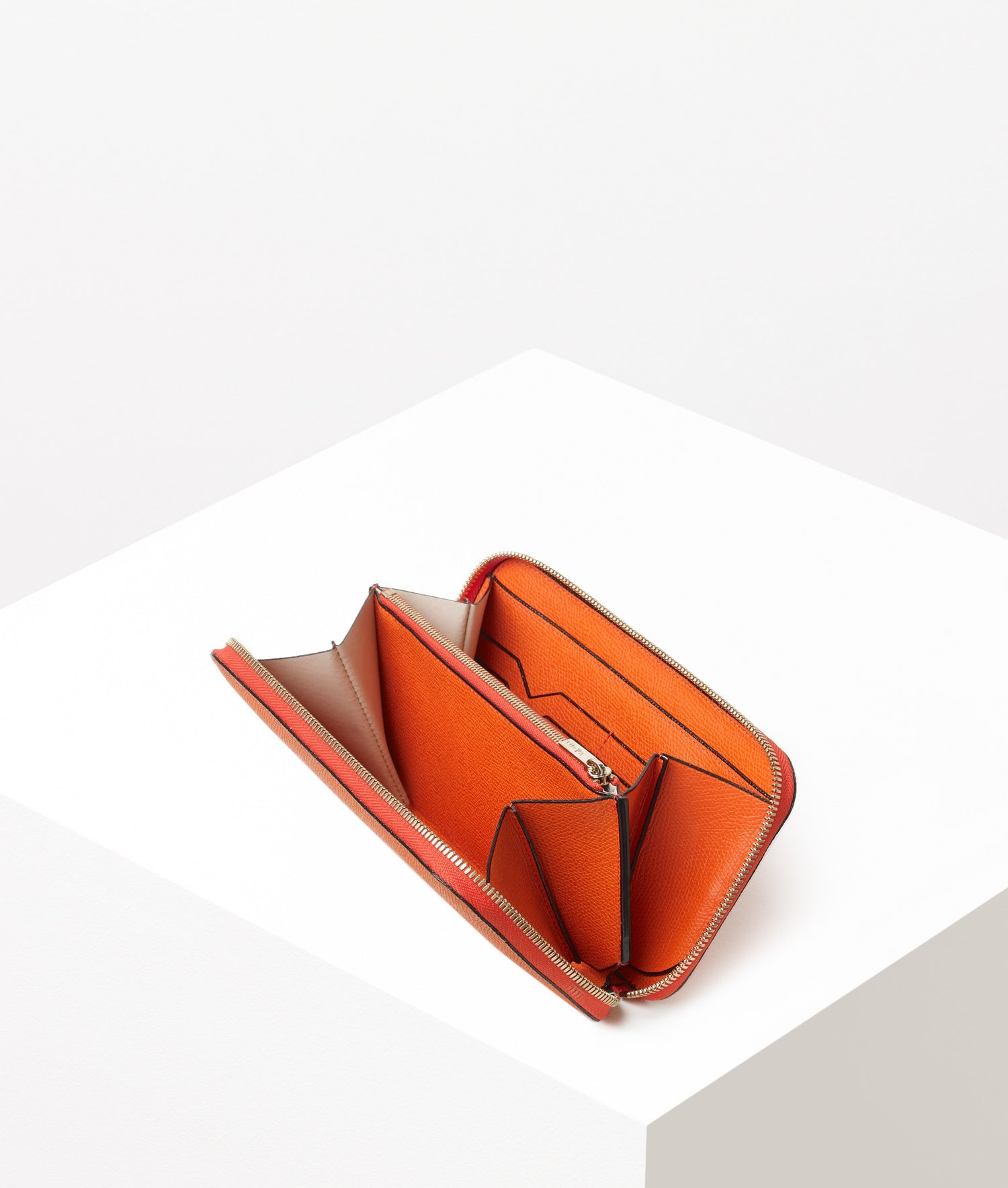 ラウンドジップ式の長財布。豊富なカラーバリエーションを展開しています。内側にはブランドの象徴であるV字カットが施された12枚用クレジットカードホルダー、紙幣や書類を収納できるフリーポケット2つと中央にはジップ式コインケース付き。パスポートも収納できるサイズです。