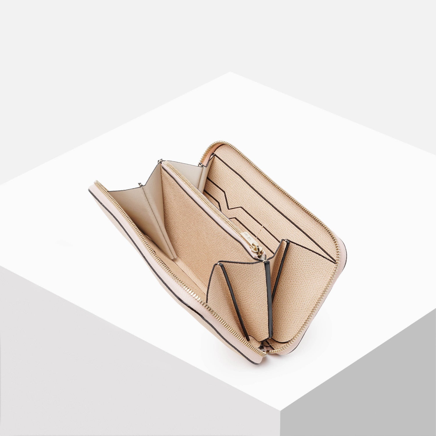 ラウンドジップ式の長財布。豊富なカラーバリエーションを展開しています。内側にはブランドの象徴であるV字カットが施された12枚用クレジットカードホルダー、紙幣や書類を収納できるフリーポケット2つと中央にはジップ式コインケース付き。パスポートも収納できるサイズです。
