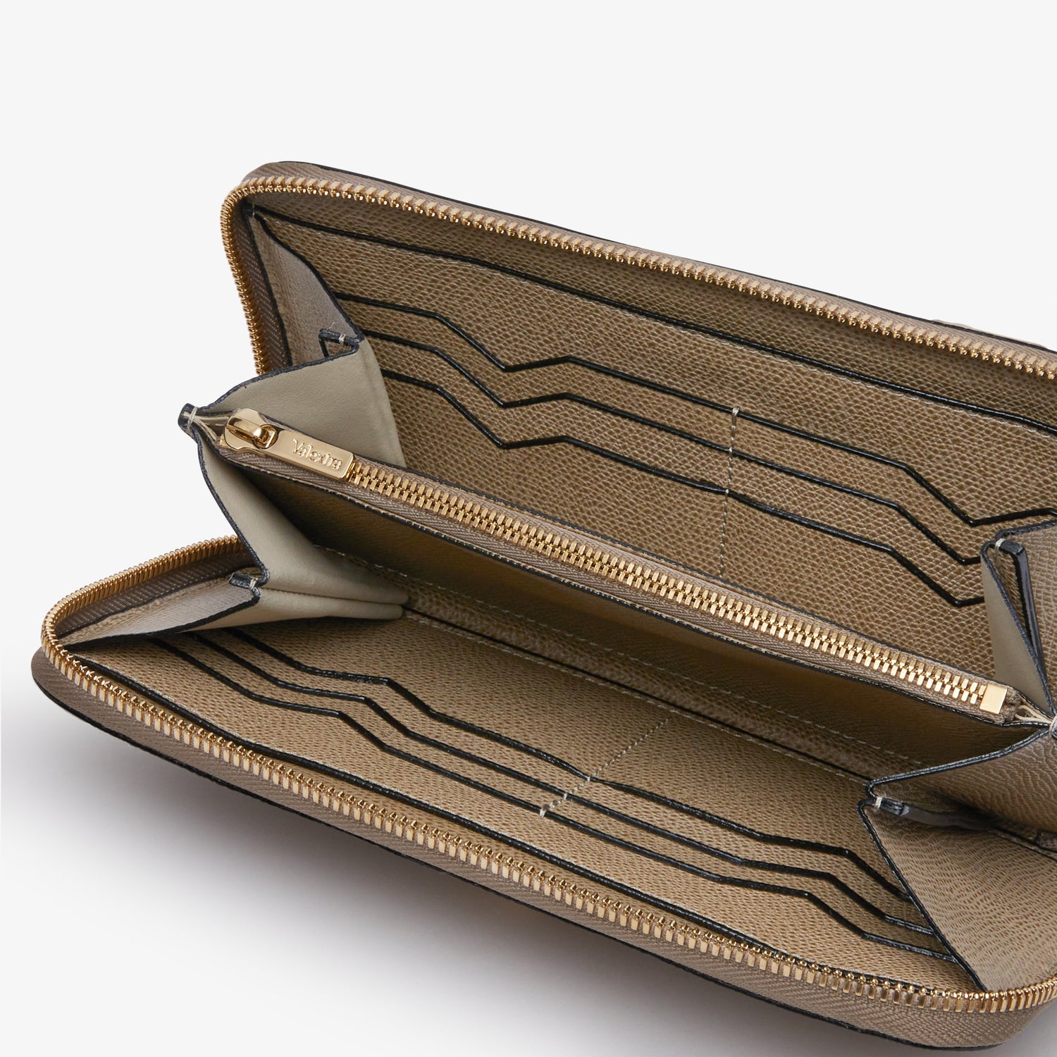 ラウンドジップ式の長財布。豊富なカラーバリエーションを展開しています。内側にはブランドの象徴であるV字カットが施された12枚用クレジットカードホルダー、紙幣や書類を収納できるフリーポケット2つと中央にはジップ式コインケース付き。パスポートも収納できるサイズです。