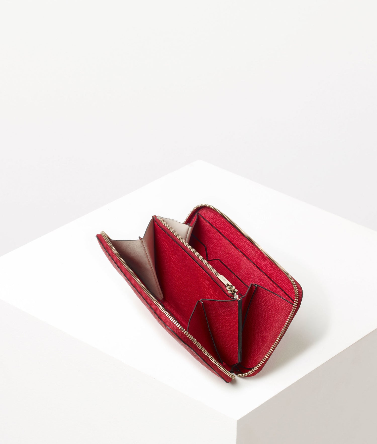 ラウンドジップ式の長財布。豊富なカラーバリエーションを展開しています。内側にはブランドの象徴であるV字カットが施された12枚用クレジットカードホルダー、紙幣や書類を収納できるフリーポケット2つと中央にはジップ式コインケース付き。パスポートも収納できるサイズです。