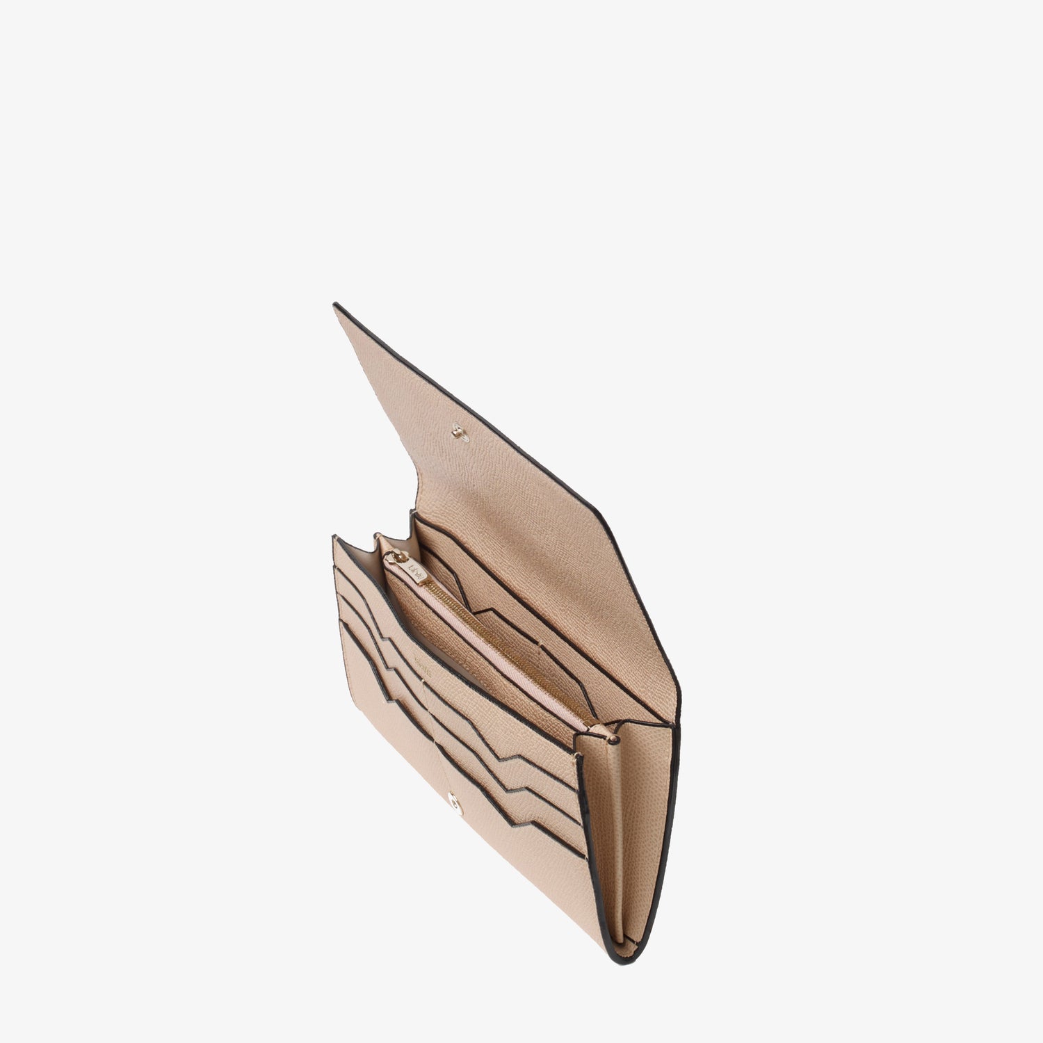 スナップ開閉式の長財布です。内側にはブランドの象徴であるV字カットが施されたクレジットカードホルダーとジップ式コインケース付き。