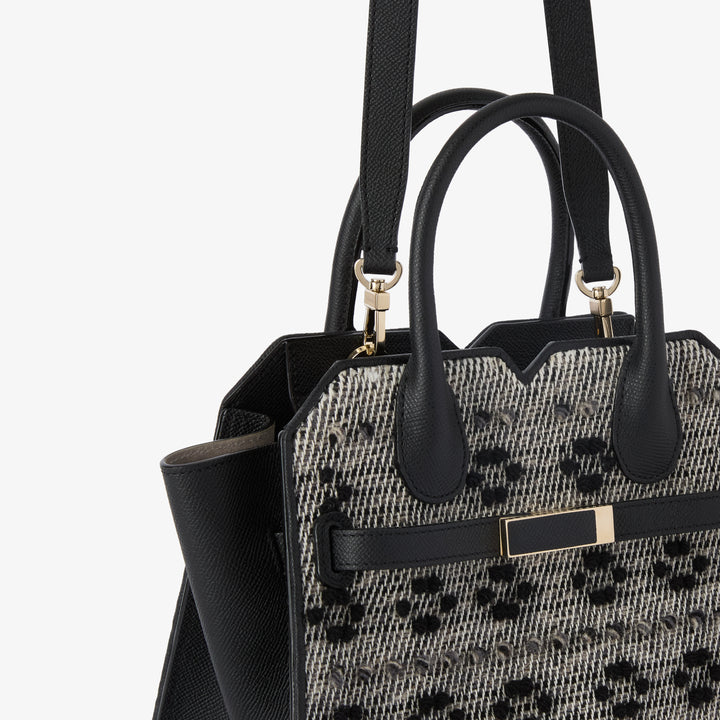 ミラノバッグ ミニ ピビオーネは、職人技と現代的なアプローチへの美しいオマージュです。このシグネチャーシルエットは、サルデーニャの伝統技法ピビオーネによって新たな表情を纏っています。この技法では、グレーとブラックの糸を用い、小さなループ状に丁寧に織り込むことで、立体的な花柄を描き出しています。その仕上がりは、クラフツマンシップと創造性が融合したラグジュアリーなキャンバスそのもの。一点ごとに異なる表情を持つ、特別なカプセルコレクションです。ハンドルやベルトディテールには、ブランドを象徴するブラックのミレプンテレザーを使用し、この印象的なバッグに際立つフレームを与えています。