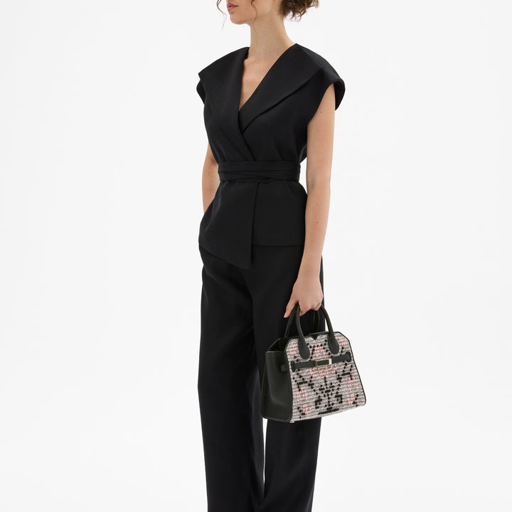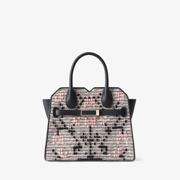 ミラノバッグ ミニ ピビオーネは、職人技と現代的なアプローチへの美しいオマージュです。このシグネチャーシルエットは、サルデーニャの伝統技法ピビオーネによって新たな表情を纏っています。この技法では、グレー、ピオニーピンク、ブラックの糸を用い、小さなループ状に丁寧に織り込むことで立体的な花柄を描き出しています。その仕上がりは、クラフツマンシップと創造性が融合したラグジュアリーなキャンバスそのもの。一点ごとに異なる表情を持つ、特別なカプセルコレクションです。ハンドルやベルトディテールには、ブランドを象徴するブラックのミレプンテレザーを使用し、この印象的なバッグに際立つフレームを与えています。