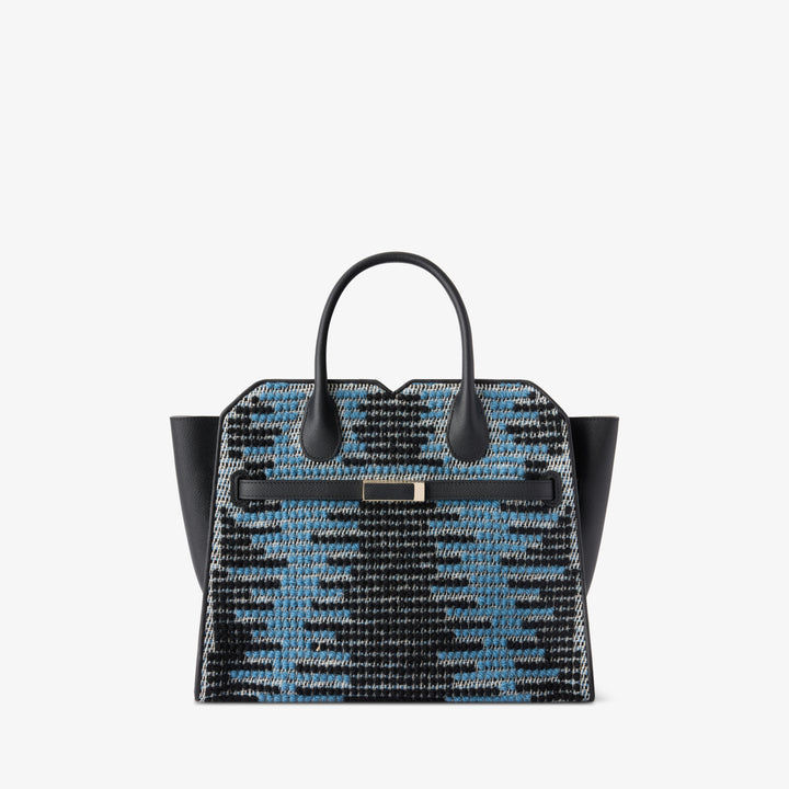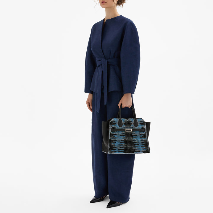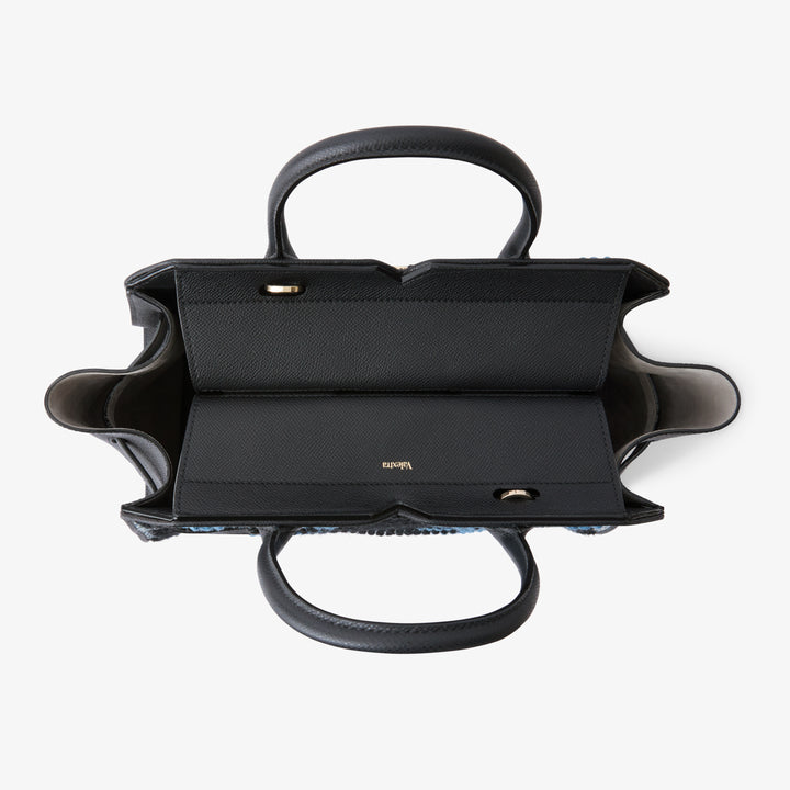 ミラノバッグ ミディアム ピビオーネは、ヴァレクストラの卓越したサヴォワフェールを讃えるモデルです。このシグネチャーシルエットは、サルデーニャの伝統技法ピビオーネによって新たな表情を纏っています。この技法では、ブラック、ナイアガラブルー、グレーの糸を用い、小さなループ状に丁寧に織り込むことで、立体的な夕景を描き出しています。その仕上がりは、クラフツマンシップと創造性が融合したラグジュアリーなキャンバスそのもの。一点ごとに異なる表情を持つ、特別なカプセルコレクションです。ハンドルやベルトディテールには、ブランドを象徴するブラックのミレプンテレザーを使用し、この印象的なバッグに際立つフレームを与えています。