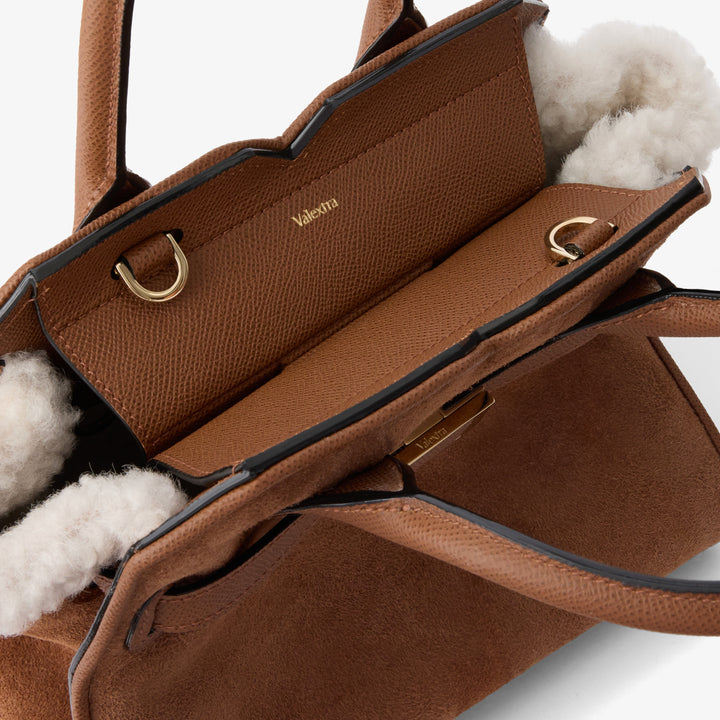 ミラノバッグは、ヴァレクストラを象徴する都会的なエレガンスの極みとして知られるアイコンバッグ。そのデザインが、上質な触感をまとい、新たな表情を見せています。これまでとは異なりスエード面を外側に配した構築的な仕立て。