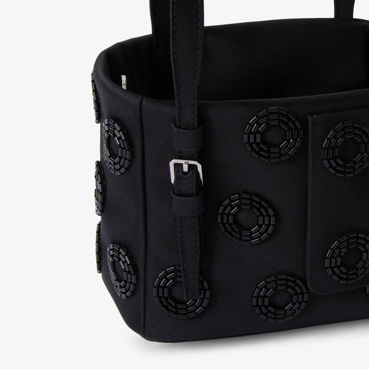 バケットバッグ ナノ ソフト フィズは、アイコンを新しいシルエットや素材で進化させ続けるヴァレクストラの革新性へのオマージュとして誕生しました。手に取るたび、眺めるたびに心が弾むような存在感を放ちます。サテンにガラスビーズを丁寧にあしらったこのバッグは、クラフツマンシップへの讃歌であり、華やかなシーンに寄り添う特別なパートナーです。細部に至るまで緻密に仕上げられ、美しさと審美眼を兼ね備えたオブジェのような佇まい。同時に、実用性も備えています。メインコンパートメントには取り外し可能なサテンポーチが付属し、貴重品をしっかりと保護。メタルストラップを付ければクロスボディとしても、トップハンドルで手持ちとしても楽しめます。
